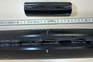 Da der NPT der Beurteilung des Rohstoffes dient, werden in den allermeisten Fällen Rohre der Dimension 110 x 10 mm (SDR11) geprüft. Der NPT an Rohren der Dimension DA 315 ist in der DIN EN ISO 13479 vorgesehen, in der Praxis allerding äußerst selten und technisch anspruchsvoll. Für einen speziellen Auftrag haben wir diese Prüfung an drei Trinkwasserrohren der Dimension DA 315 x 18,7 mm (SDR17) durchgeführt. Deutlich sichtbar wird der Größenunterschied der Kerben an einem Rohr DA 315 zu DA 110 in Abbildung 3. Abbildung 4 zeigt die die Bruchflächen der geöffneten Kerben der Rohre DA 315 und DA 110 nebeneinander.
