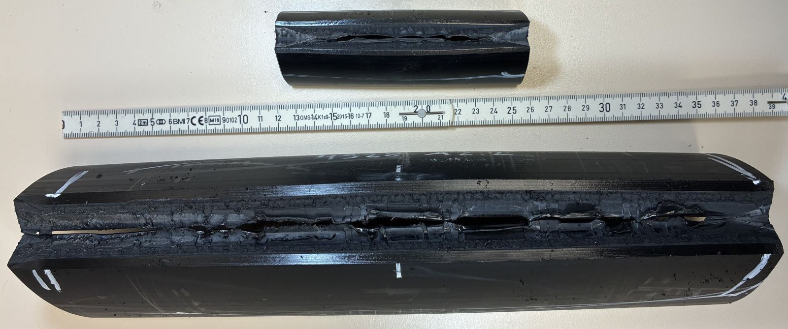 As the NPT is intended for the assessment of the raw material, pipes with the dimension OD 110 × 10 mm (SDR 11) are used in the majority of cases. Although the application of the NPT to pipes with OD 315 mm is specified in DIN EN ISO 13479, such testing is rarely performed in practice due to the associated technical complexity. The difference in notch size between a pipe with an outside diameter of 315 mm and a pipe with an outside diameter of 110 mm is clearly visible in Figure 3. Figure 4 shows the fracture surfaces at the opened notches of the pipes with outside diameters of 315 mm and 110 mm arranged side by side.